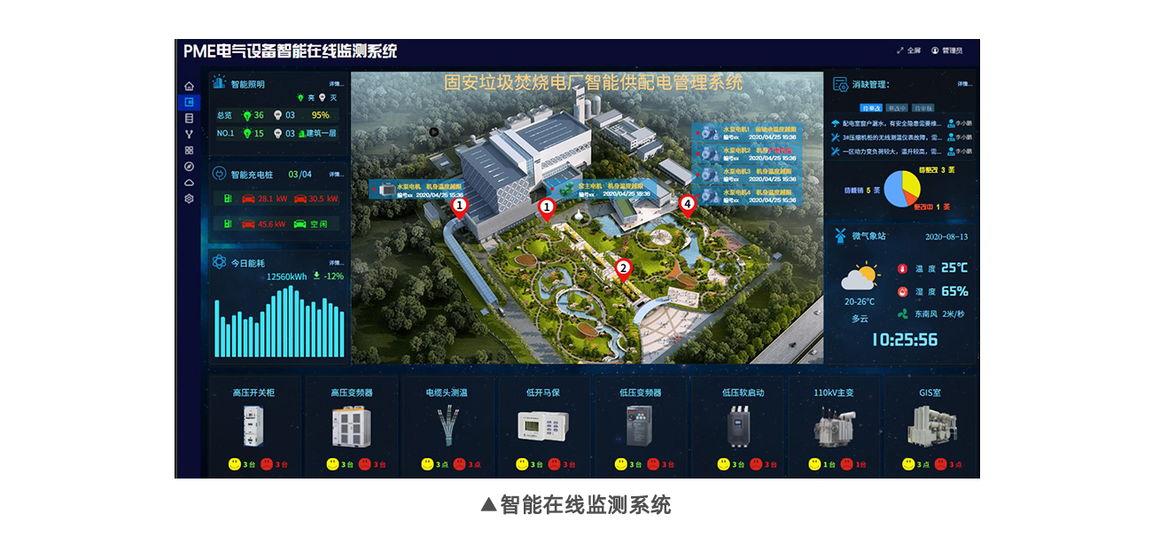 該系統除具備開關柜的剩余壽命分析、溫度特性分析等算法外,還將GIS監測、綜合自動化監控、能源管理、智能照明、微氣象站和智能充電樁系統融于一體,可采集高壓開關柜、高壓變頻器、低壓馬保、低壓變頻器、低壓軟起動器、電纜頭等設備的運營數據,通過專業算法進行分析,預測、預判電氣設備的健康狀態,將原本需要人工巡檢才能發現以及人工巡檢都無法發現的故障隱患都能被精確地反映出來,減少了電氣設備的巡檢工作量,提高巡檢效率,為電氣系統安全提供有力保障。