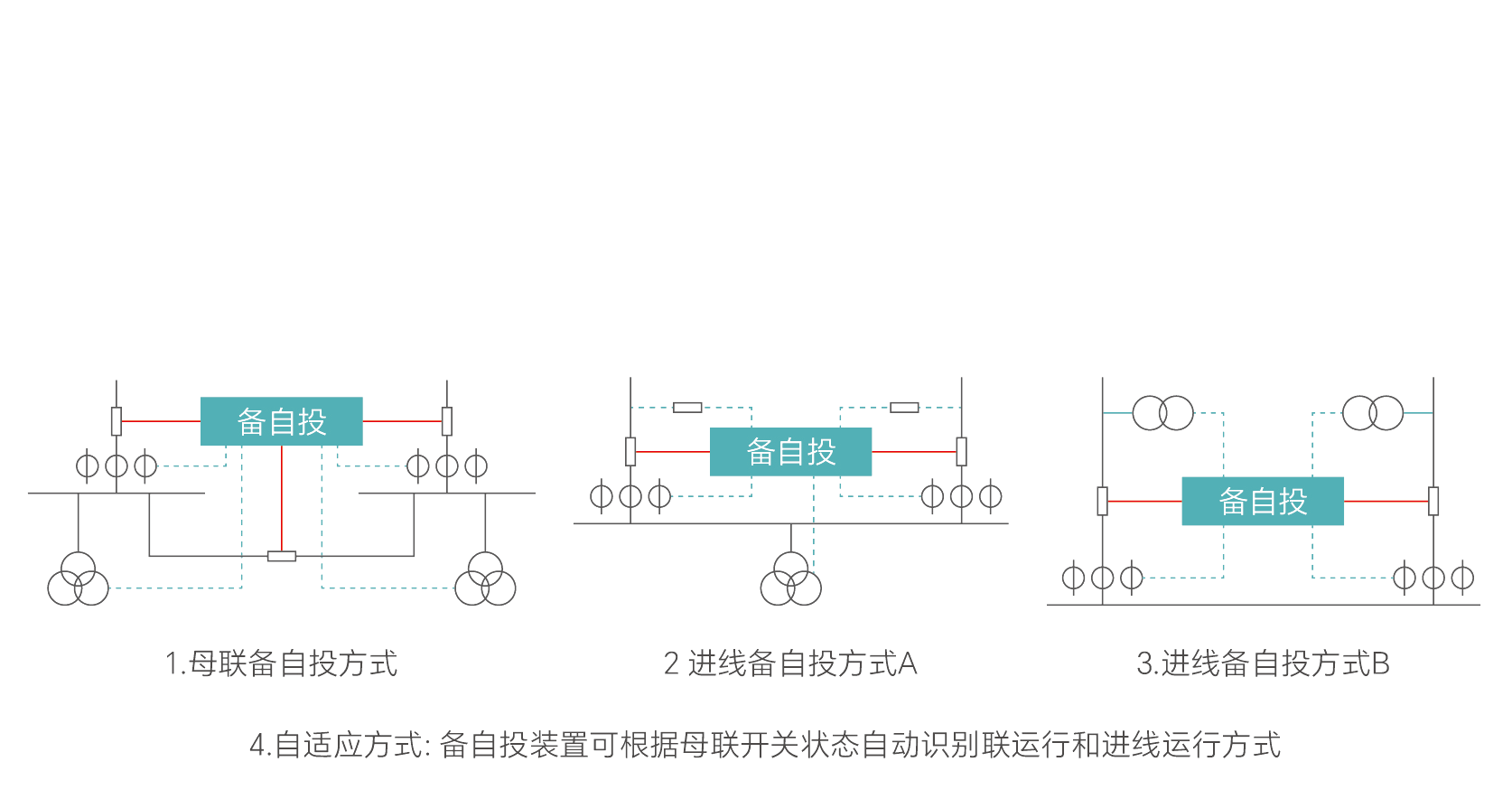 備用電源自投裝置適用于各種電壓等級的備用電源自動投切及自動復位,可根據系統結構進行四種不同形式的自投自復。