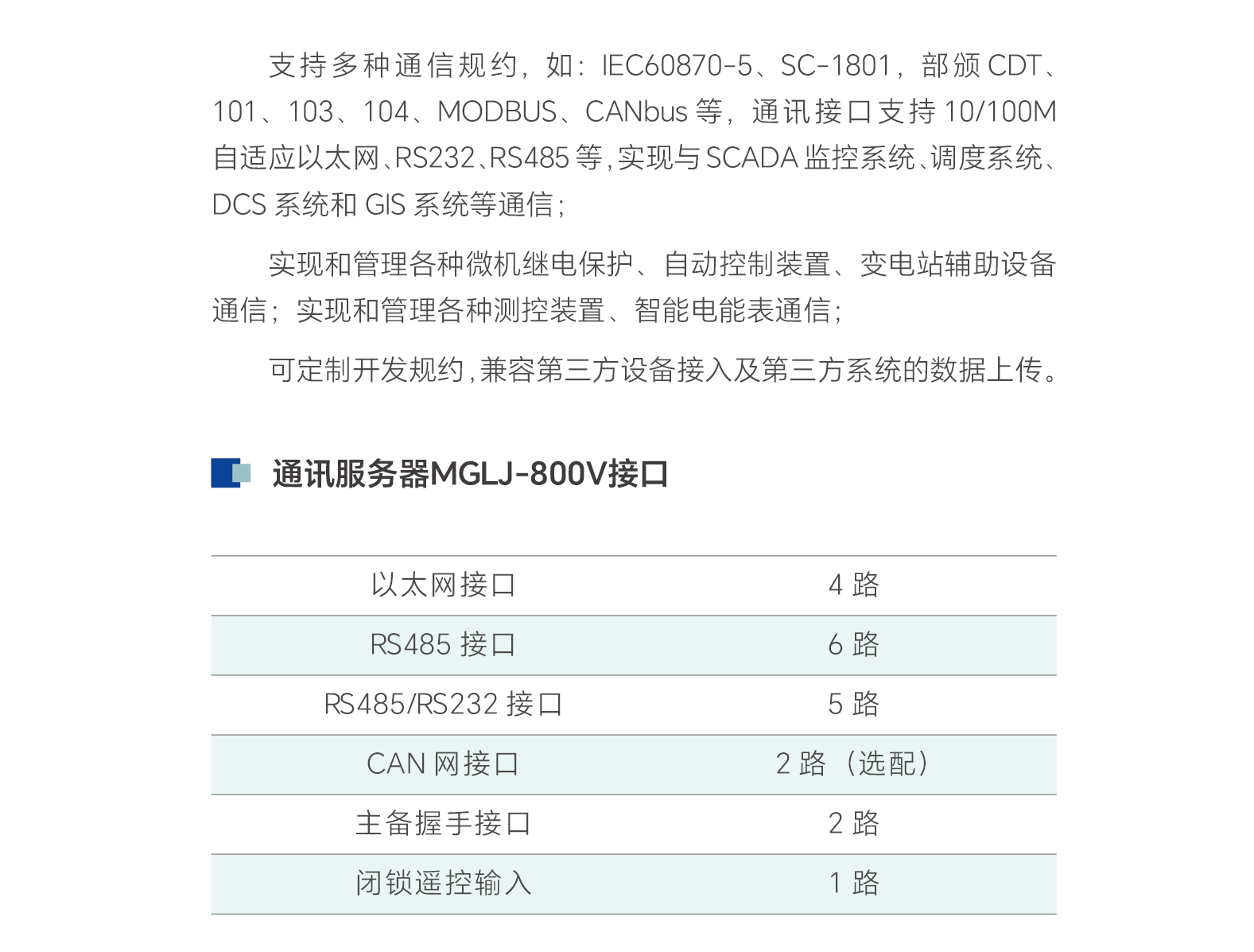 MGLJ-800V型通訊服務器是現場設備與監控系統之間的橋梁,是綜合自動化系統的一個重要組成部分。可實現RS-232/485 串口與以太網口的數據雙向透明傳輸,可選擇不同規約采集、處理并轉發現場設備的數據。支持雙機主備運行模式,保障系統安全穩定運行。