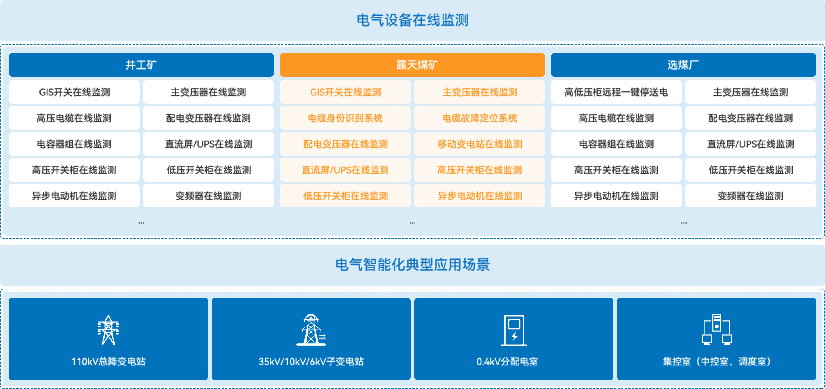 煤炭企業主要分成井工煤礦、露天煤礦、選煤廠三大板塊,不同板塊依據各自供配電特點進行電氣設備的在線監測建設和應用。